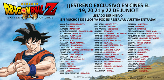 Dragon Ball Z: Battle of Gods just premiered in theaters on June 19, 2014, in Seville, Cuidad Real, and other major cities in Spain.