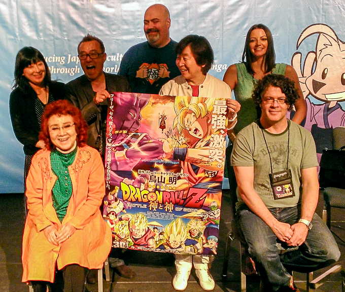 The Dragon Ball Z cast next to the signed Battle of Gods poster: