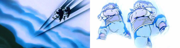 For example, in Dragon Ball Z episode 32, Oozaru Vegeta is jumping toward Goku and Goku sees the sun behind him, so he is reminded of the taiyō-ken and says, “That’s it!” Then he jumps toward Vegeta’s face, says “Tenshinhan! I’m going to borrow your technique!” and then performs the taiyō-ken.
