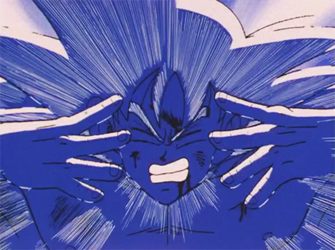 The light emits from Goku’s entire body and blinds Vegeta, allowing Goku to escape.