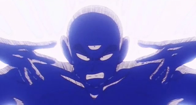 Here Krillin uses a variation of the taiyō-ken’s hand technique where he points his fingers at his forehead. This was only seen once.