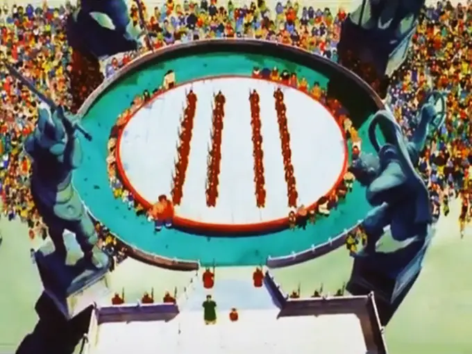 The last example is in Emperor Chaozu’s tournament, in the film Dragon Ball: Mystical Adventure (1988). Fighters are competing on a large circular Lei Tai, with the winner being granted any one request by the Emperor.